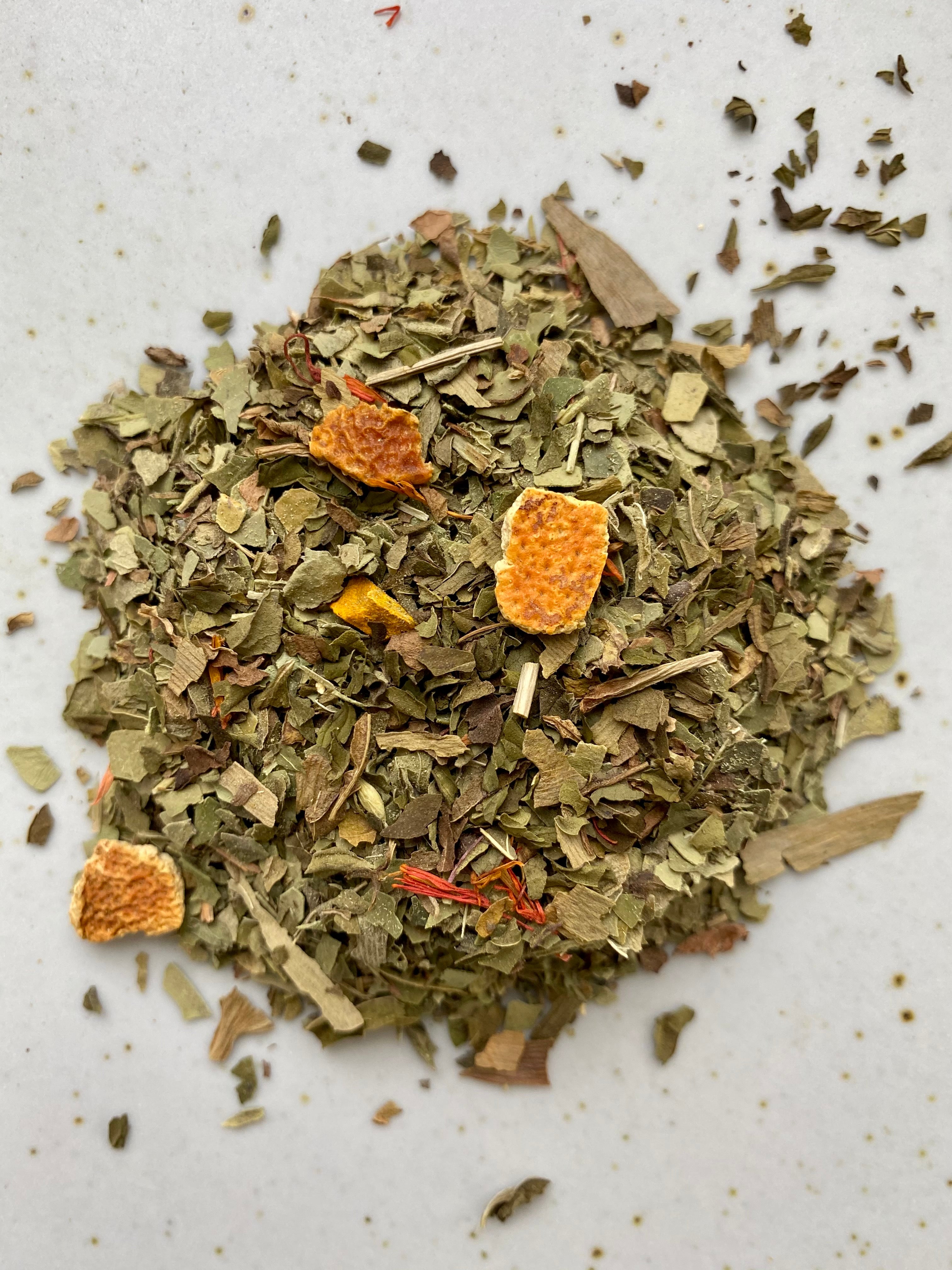 Ingrédients: Maté vert bio, menthe verte, menthe poivrée, ginkgo biloba, matcha yerba maté bio, orange, curcuma, citrouille, pétale de carthame