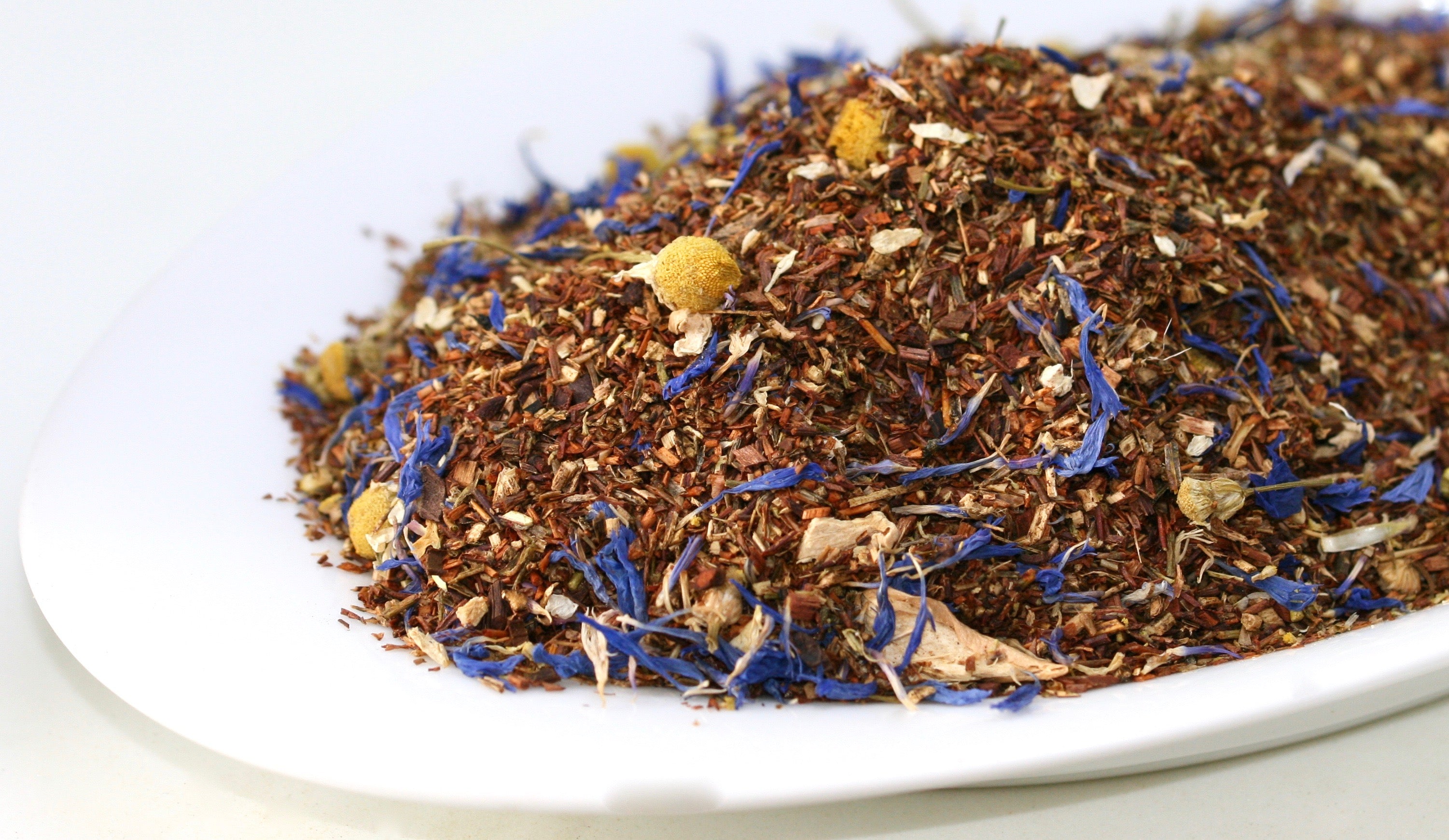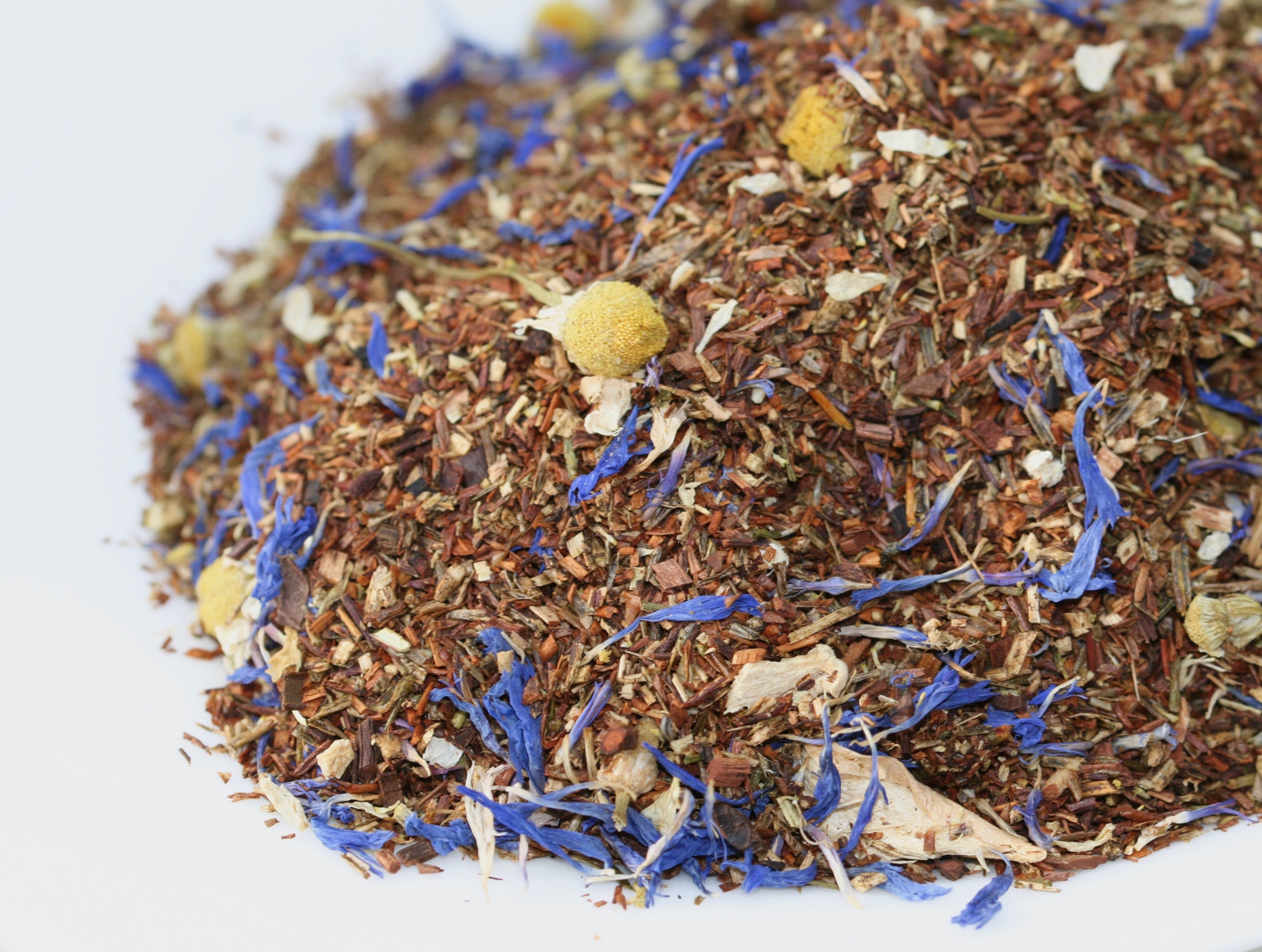 Ingrédients: Rooibos, Rooibos Verts, Honeybush, Fleurs de Camomille, baies de Goji, morceaux de gingembre, pétales de bleuet, ginseng, saveur naturelle