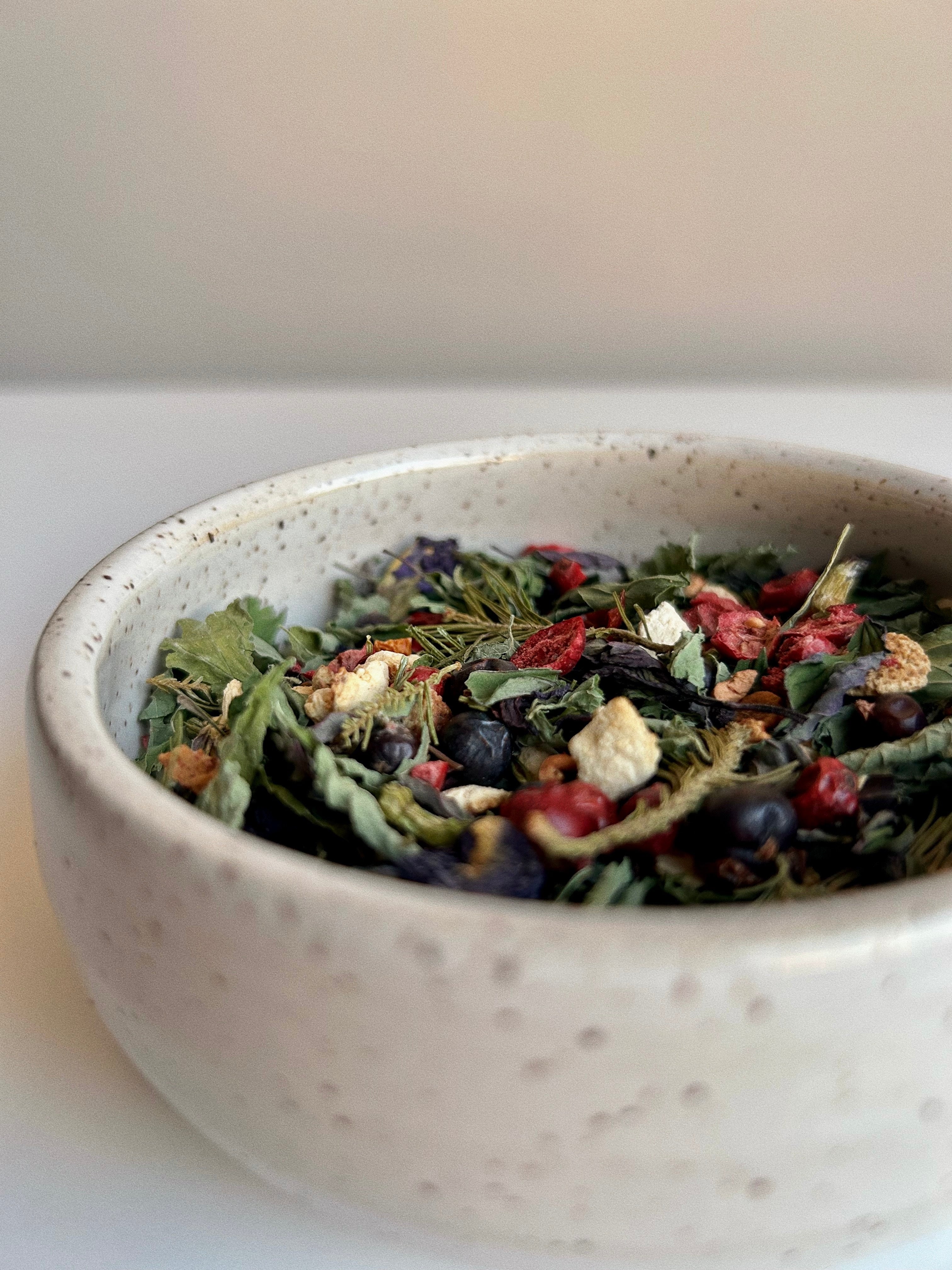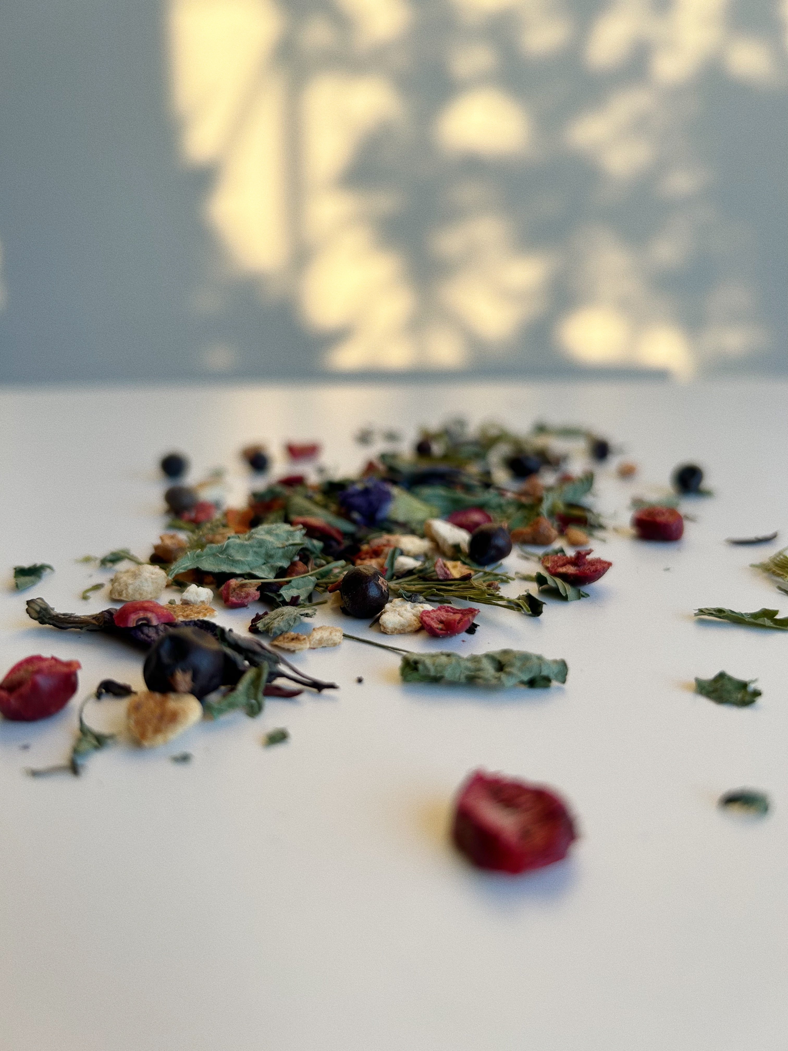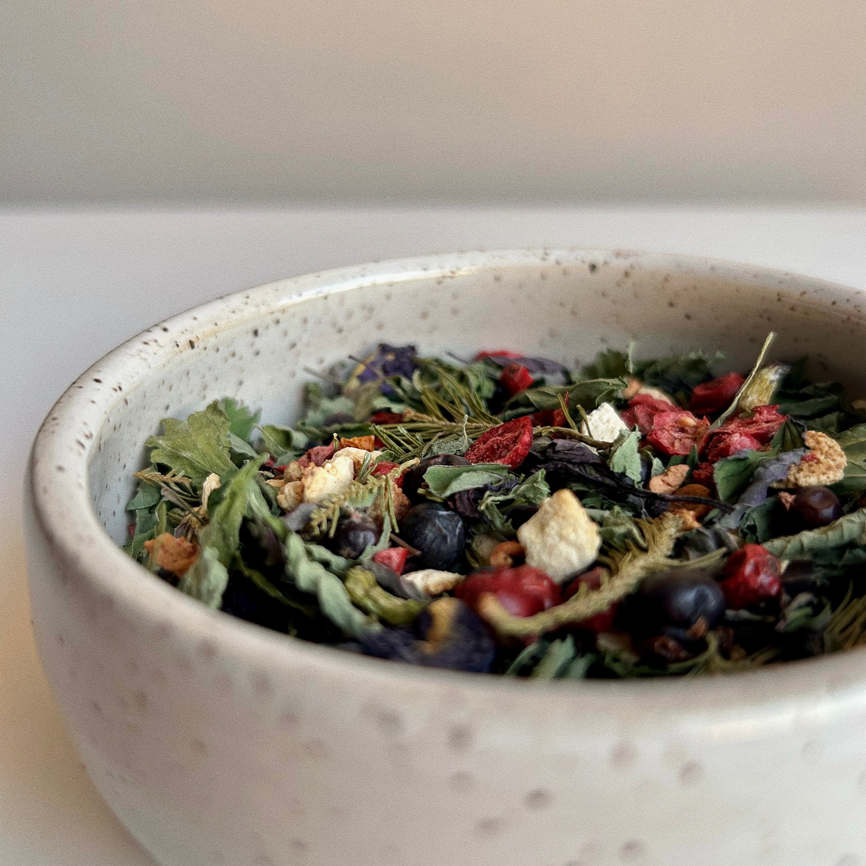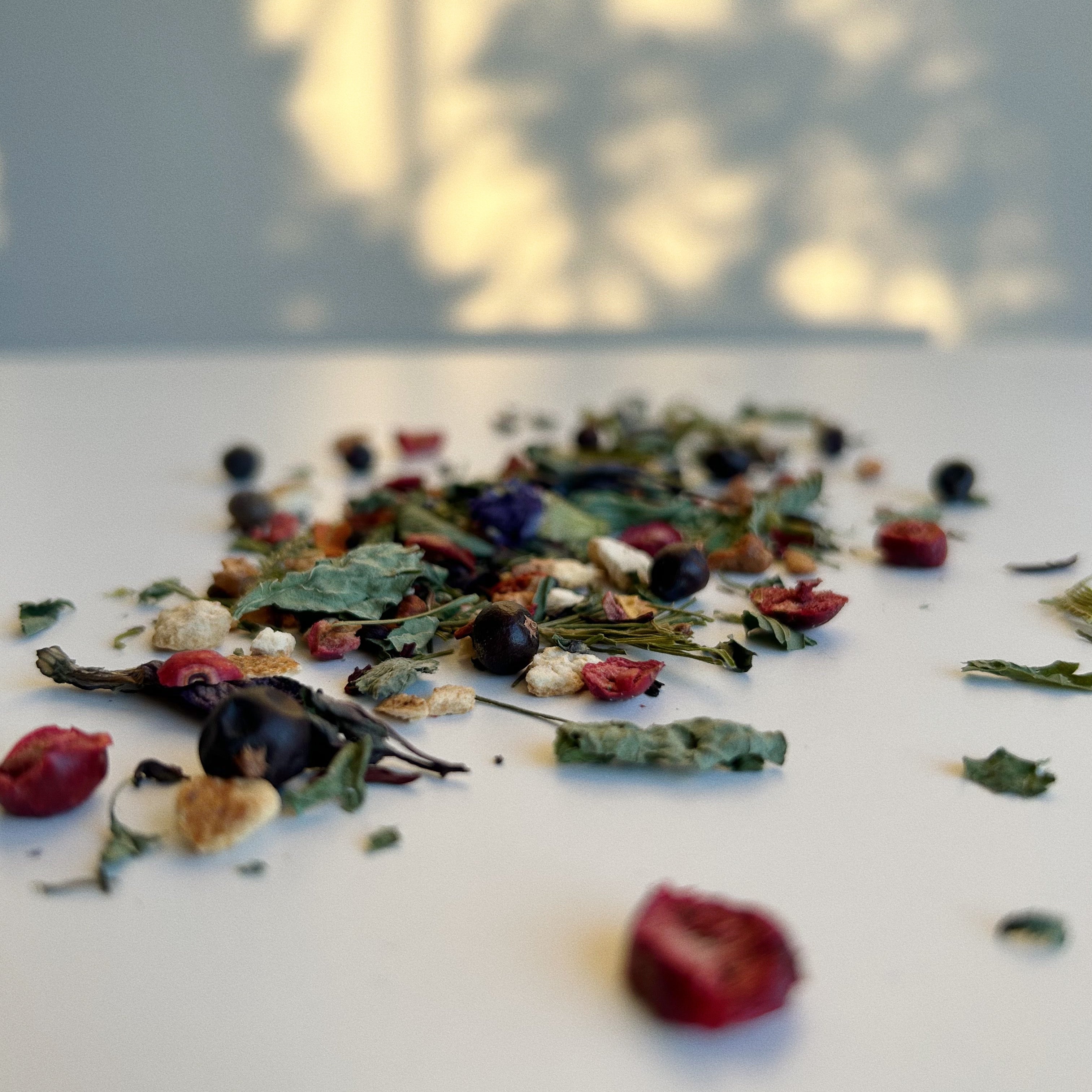 Ingrédients: Menthe poivrée, Sapin, Baie de genièvre, Canneberge, Écorce de pamplemousse, Fleurs de pois bleu, Mélisse, Pomme, Hibiscus, Églantier, Baie de sureau, Arômes naturels