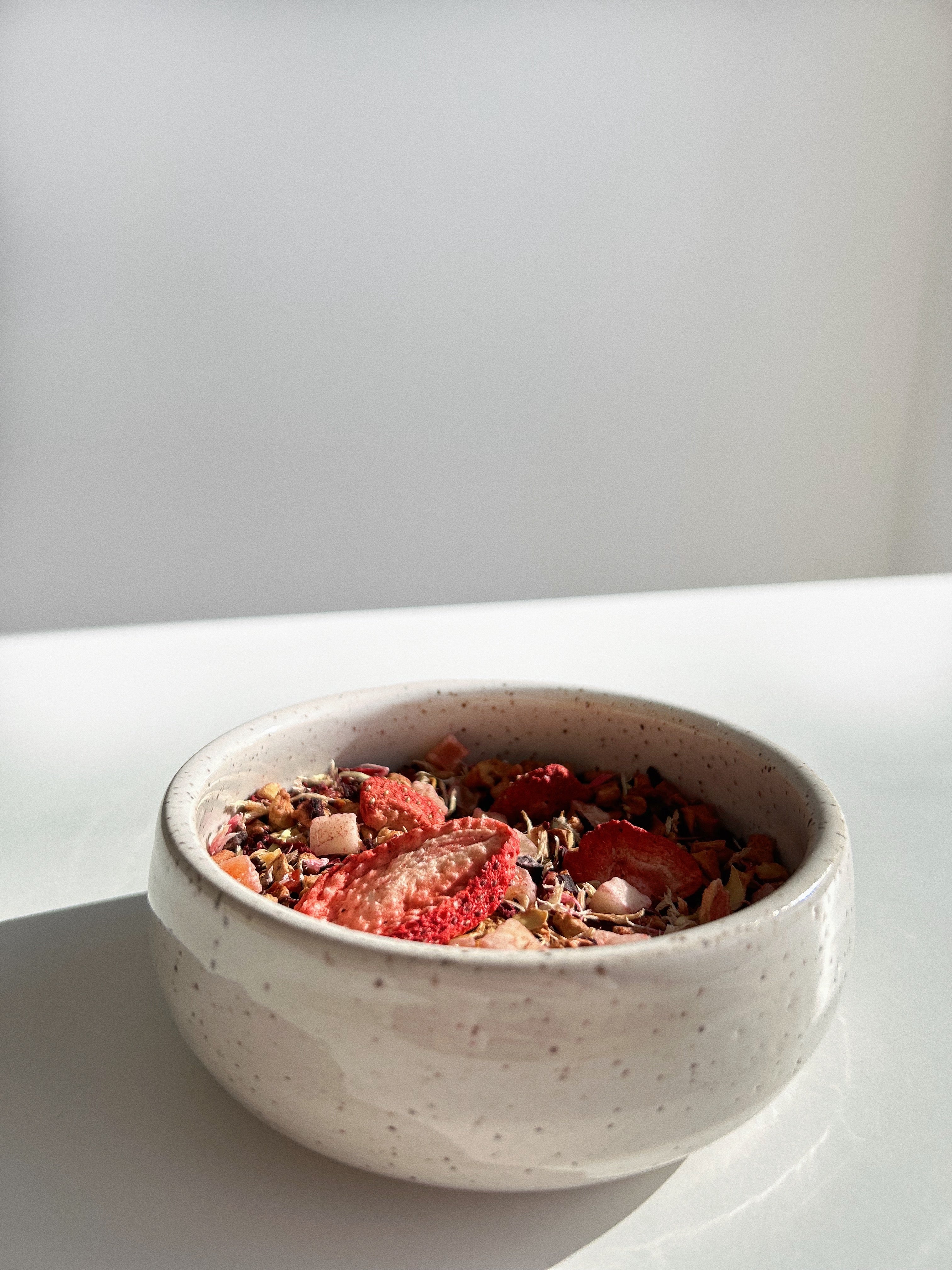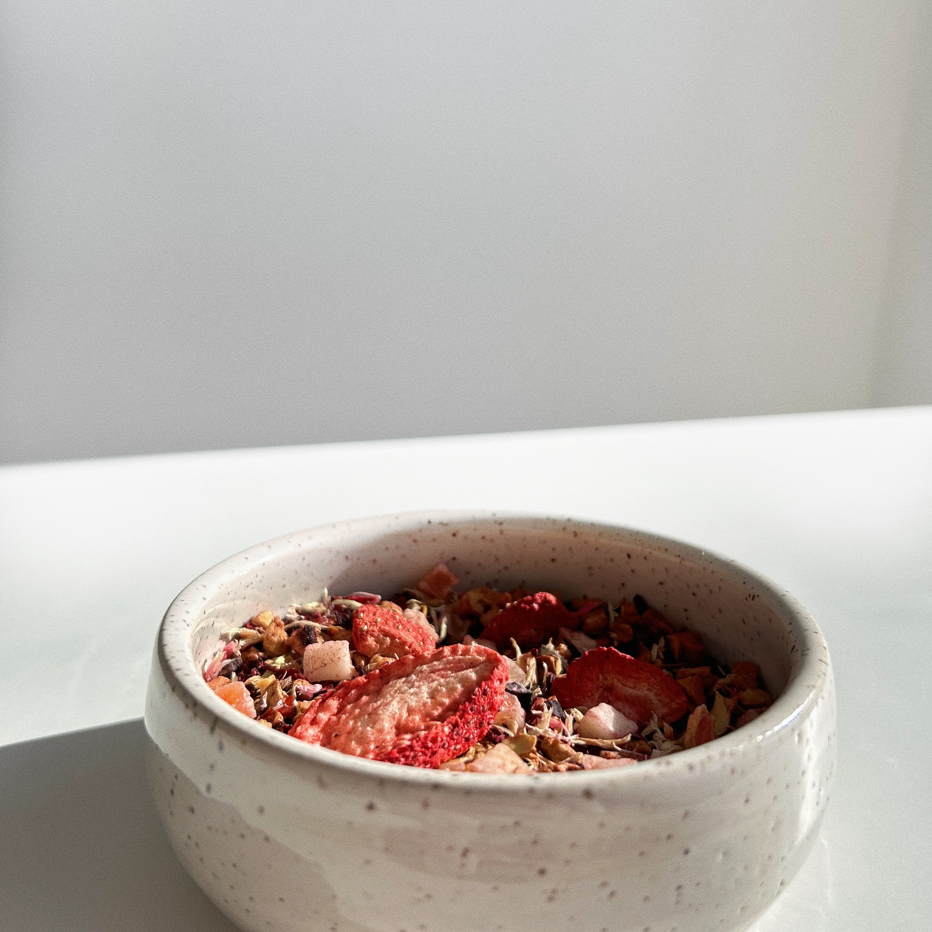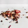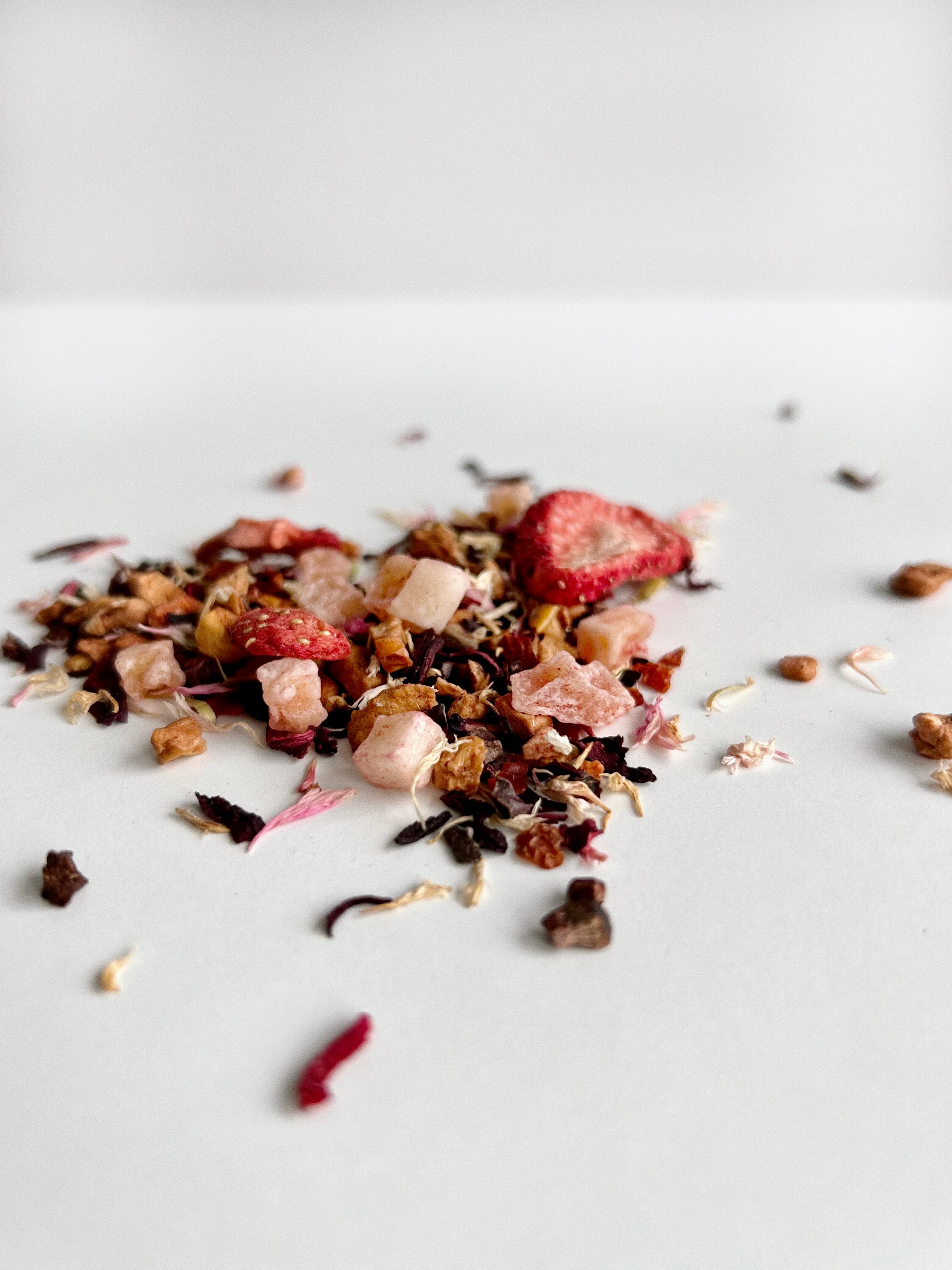 Ingrédients: Pomme, hibiscus, églantier, fraise, papaye, fèves de cacao, pétales de bleuets, arômes naturels