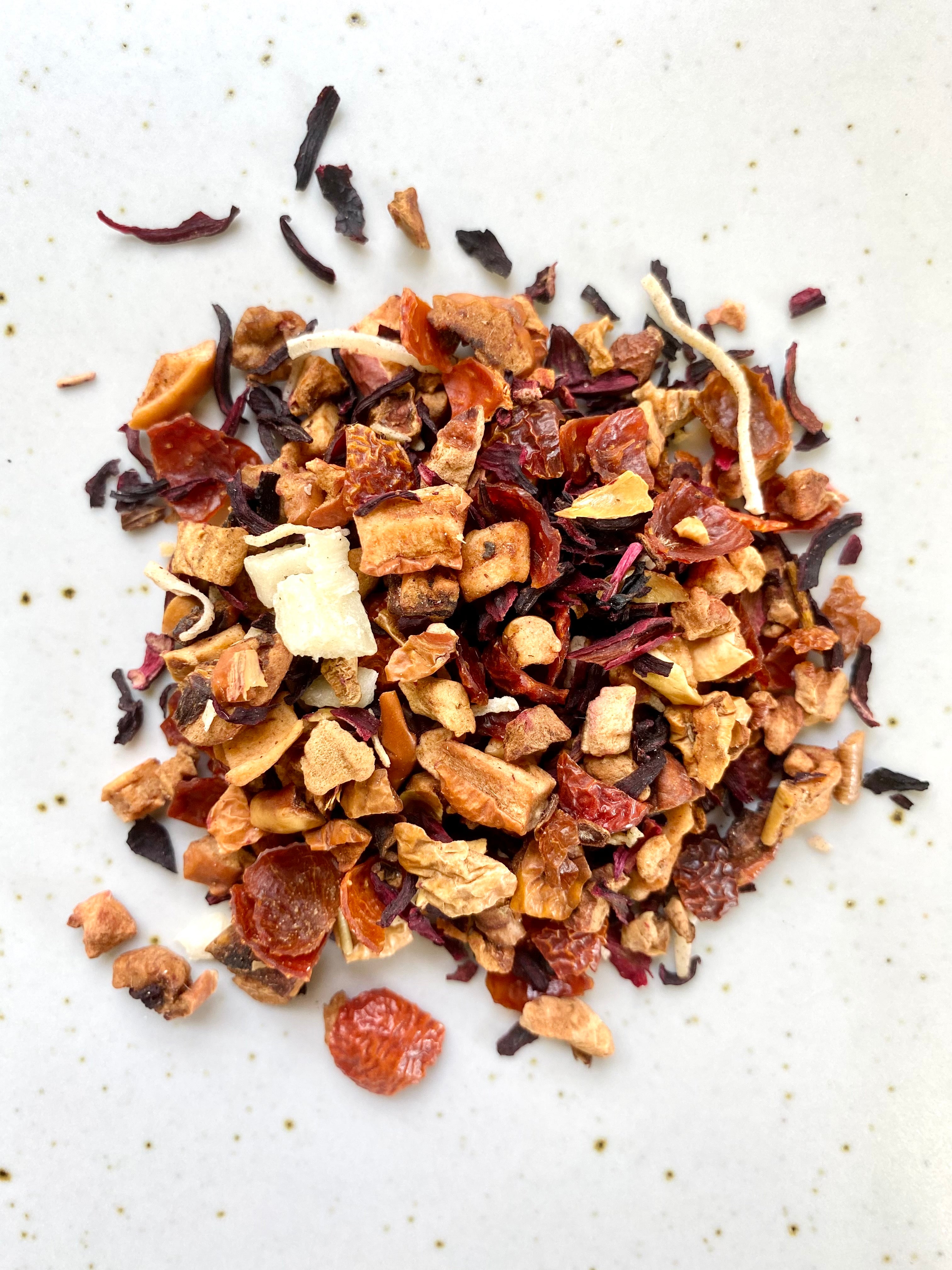 ingrédients: Pomme, églantier, ananas, noix de coco, hibiscus, arôme naturel