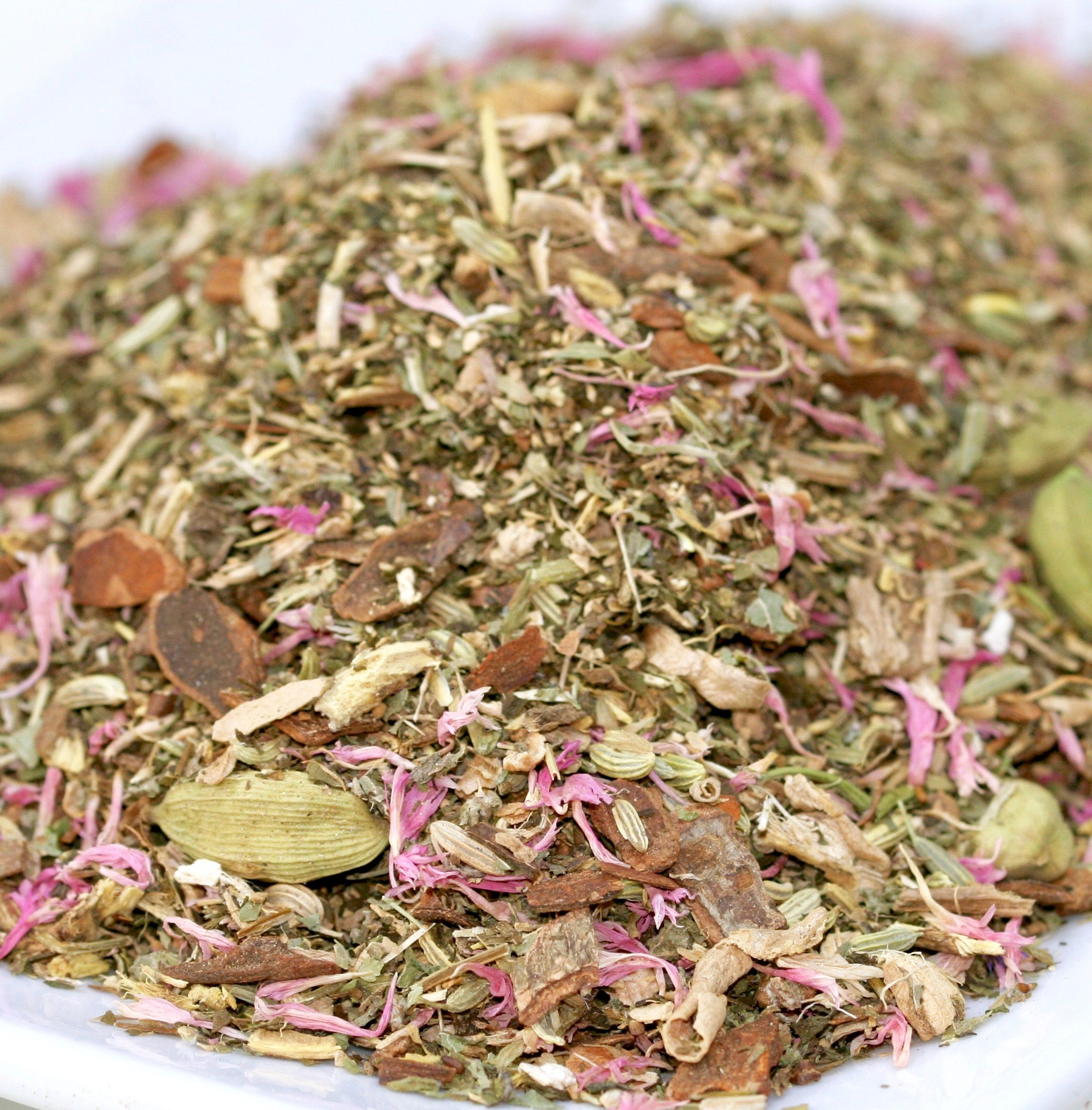 Ingrédients : Gingembre, menthe poivré, cannelle, cardamome, mélisse, réglisse, fenouil, racine de bardane, pétales de bleuets
