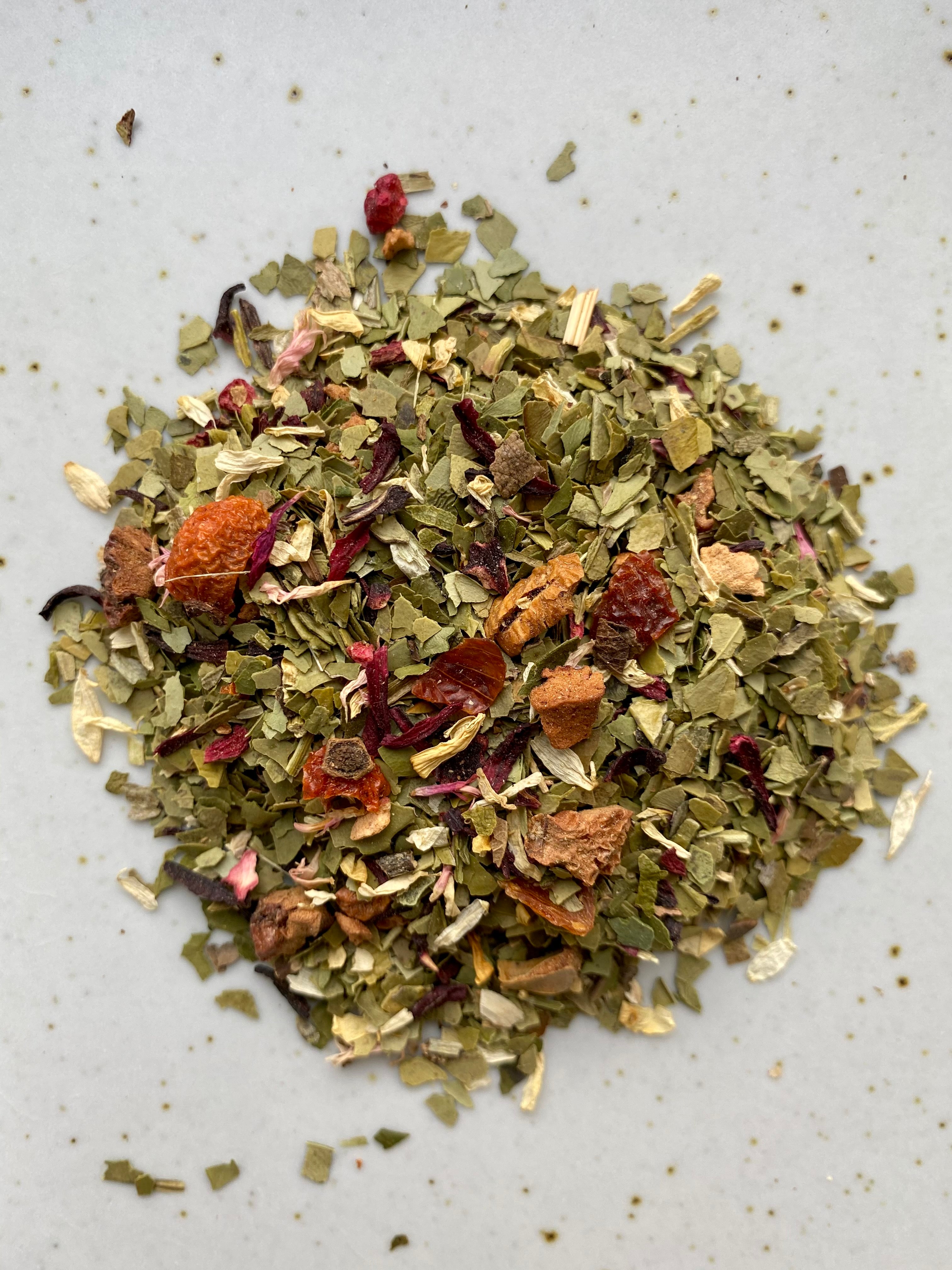 Organic Ingredients: Green Mate, Apple, Hibiscus, Rosehip, Lemon Peel, Chamomile, Cornflower Petal, Strawberry Leaf, Raspberry, Natural Flavors