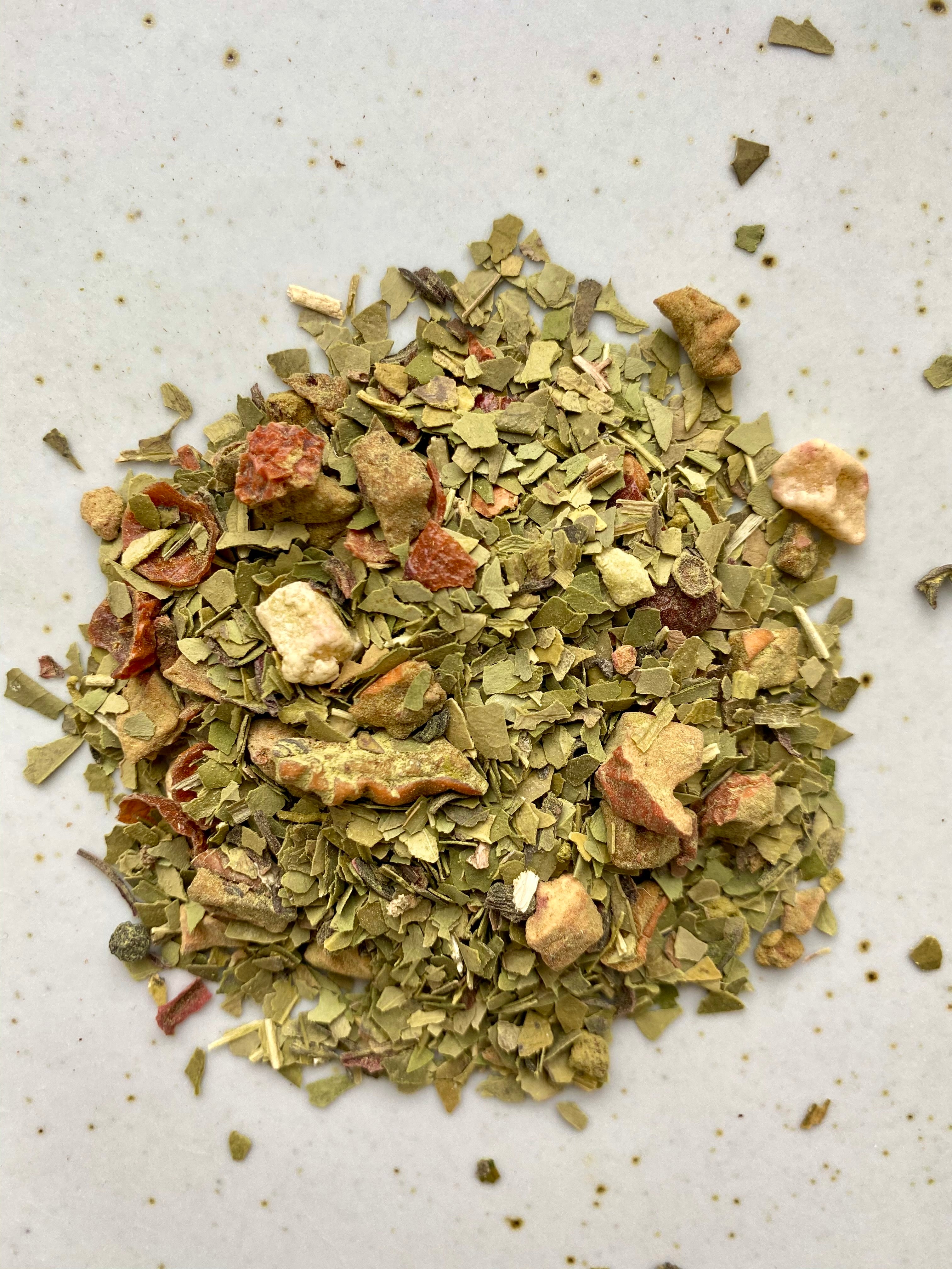 Ingredients: Organic green mate, apple, mango, pineapple, rosehip, coconut, mango matcha, hibiscus, elderberry, natural flavors