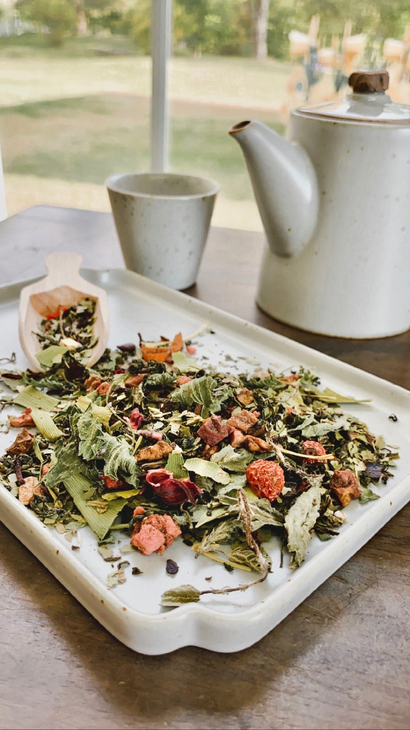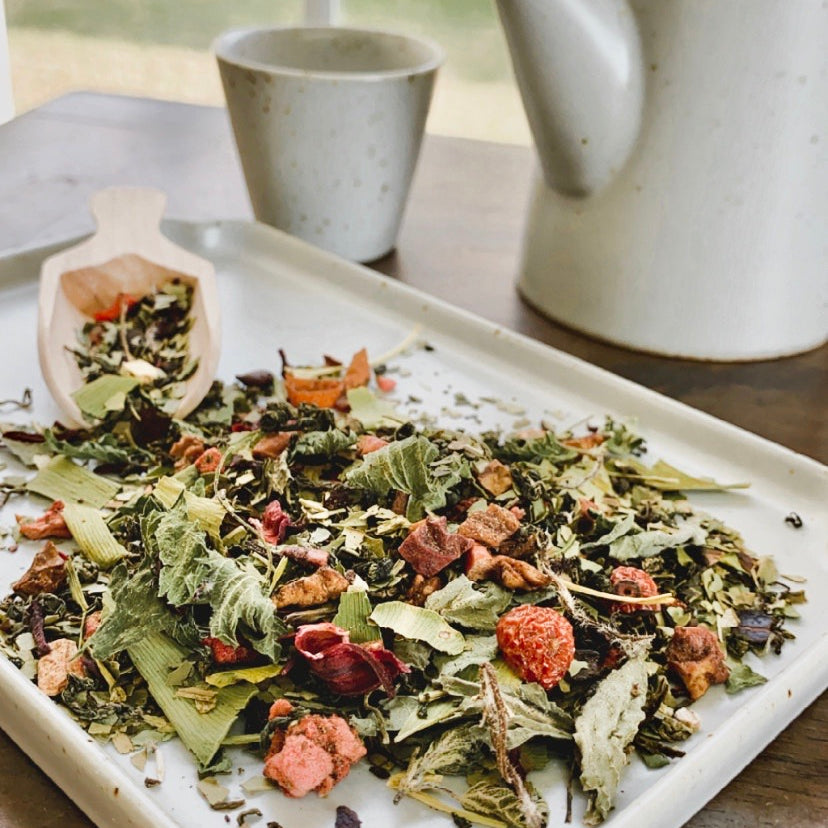 Ingredients: Mate, holy basil, gynostemma, nettle, ginkgo biloba, apples, kiwi, rosehips, strawberries and hibiscus.