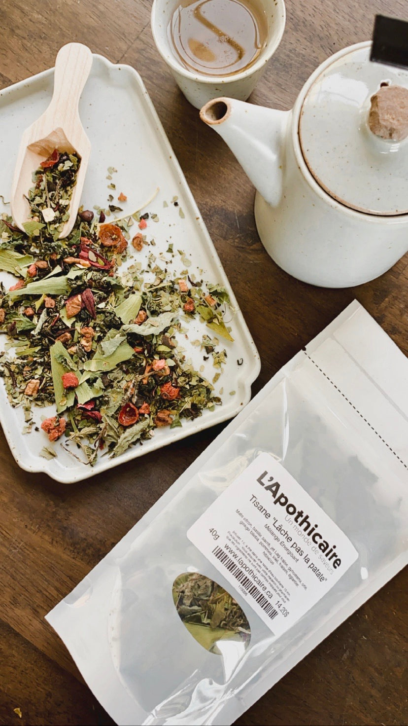 Bye bye coffee! The "Lâche pas la patate" herbal tea is an energizing blend specially designed to give tired bodies a boost and help you get through busier days. Its distinctive herbal, lemony, and slightly fruity flavor makes it the perfect way to start the day.
