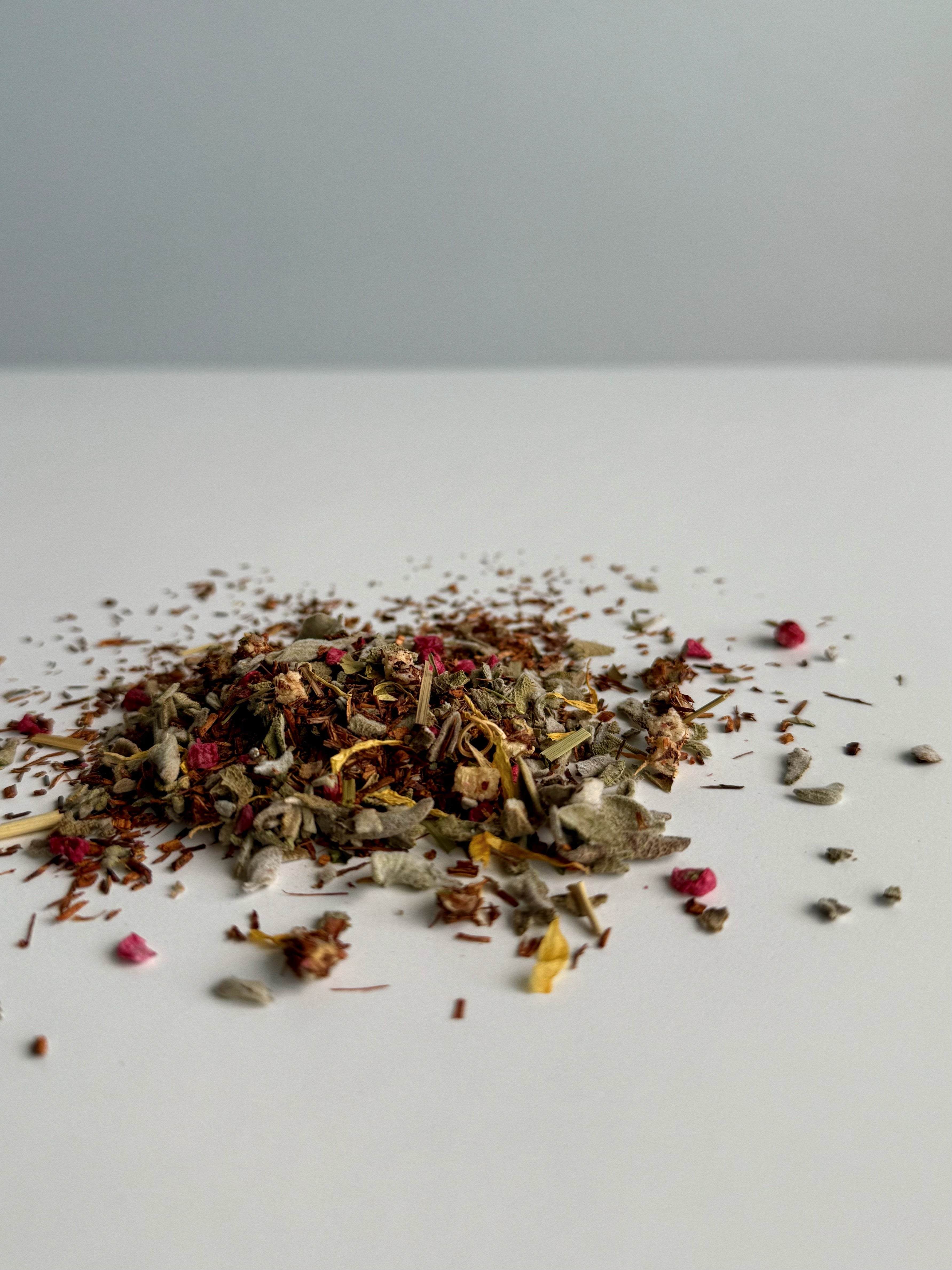 Pensée avec soin pour Sauge Café, un lieu chaleureux et accueillant au bord du lac Davignon à Cowansville, cette infusion marie un rooibos velouté à la sauge herbacée, soutenue par la douceur de la framboise, le fruité subtil de la poire et la vivacité du citron. L’ensemble offre une tisane réconfortante, délicatement fruitée et aromatique, idéale à savourer aussi bien chaude que glacée.