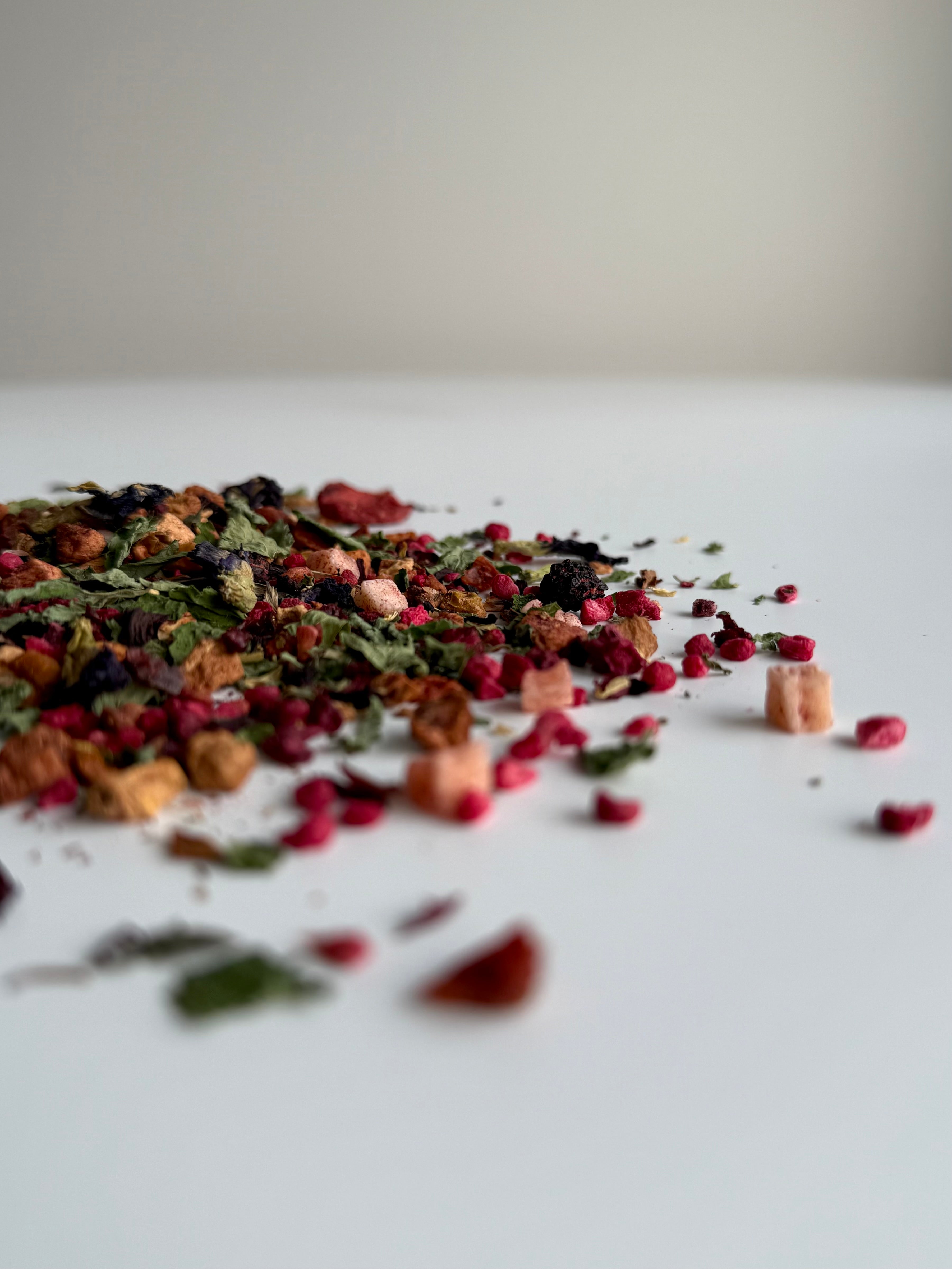 Ingrédients : Mélisse, fleur de pois bleu, framboise, mûre, hibiscus, fraise, papaye, citron, pomme, églantier, camomille, pétale de tournesol, feuille de fraisier, arômes naturels