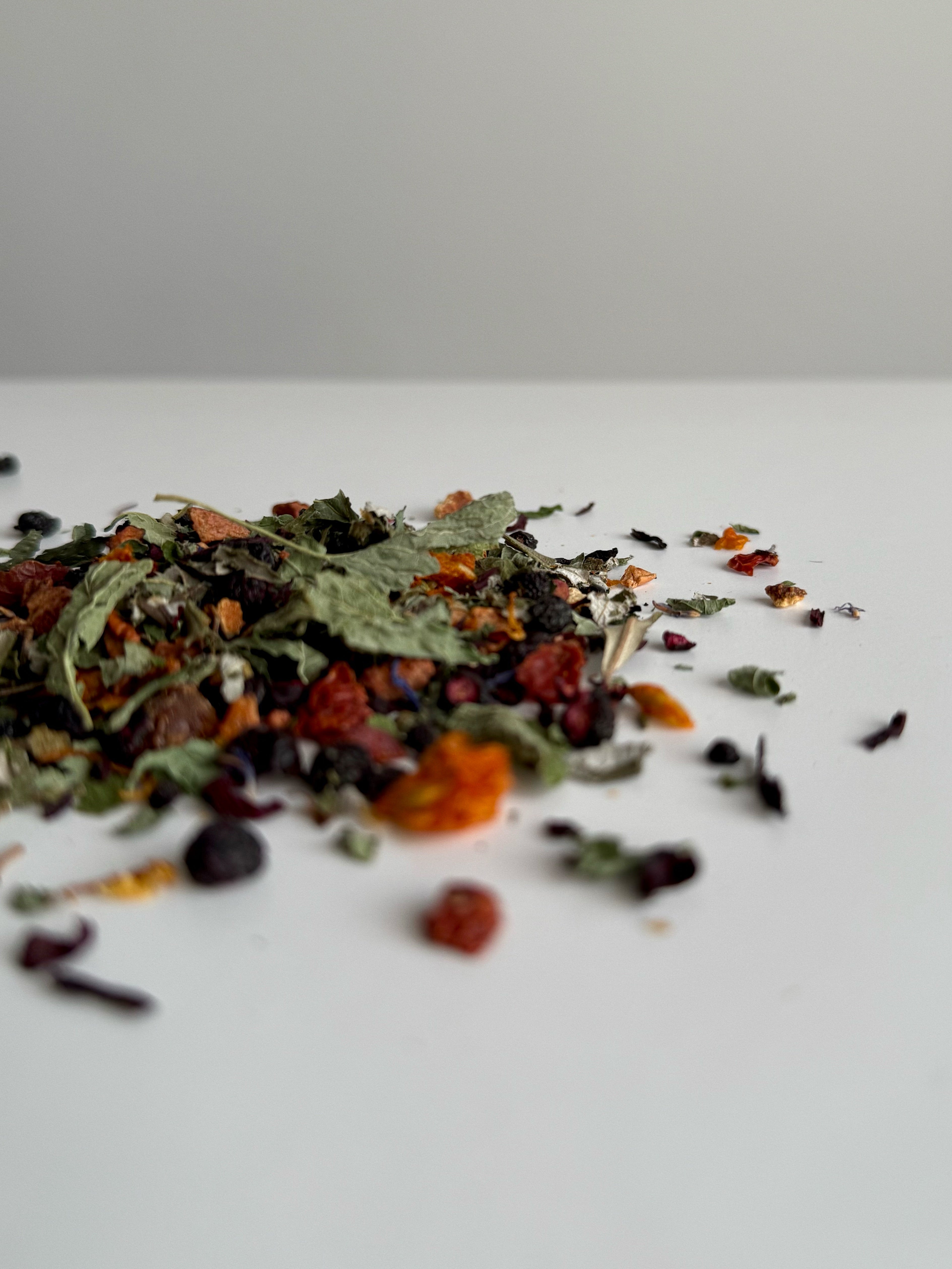 Ingrédients : Mélisse, Framboisier, Feuille et pulpe d’argousier, Hibiscus, Pomme, Sureau, Bleuet, Pétale de bleuet, Églantier, Orange, Calendule, Arômes naturels